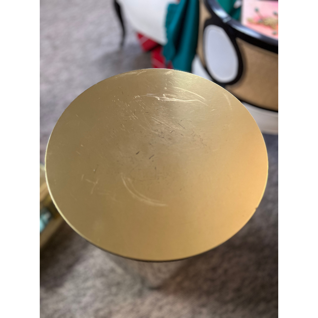Set of 3 vintage brass pedestals signed by designer C. Jere, circa late 1980s. Great for displaying objet d'art or a plant. The smallest one is 16 inches and works perfect as a side table. The set is brass plated and wear to the finish is consistent with age and use (see photos) including a small dent. Each column is light to carry and hollow inside. Due to condition issues, a custom mirrored top was added to the smallest pedestal making it a real standout. The plated brass has a reflective quality which is really lovely in the evening light.