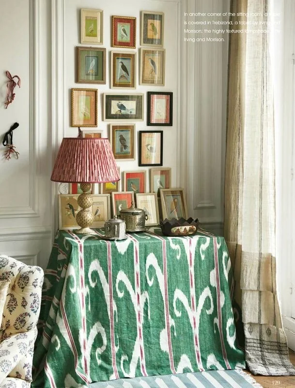 It’s week 2 of the One Room Challenge (ORC) and some progress has been made on the to-do list! First my custom lamps shades have arrived and came out better than expected. It’s the little details like this that pull a room together. My idea for having the bookcase outfitting with a custom skirt got nix as I came up with a clever budget friendly DIY. I’ve decided to go with a more relaxed look and not do a tailored skirted table. Instead, I’m going to drape upholstery grade fabric over the cabinet and have a piece of glass cut to for the top to secure the fabric from slipping. Below is my inspiration for the look.