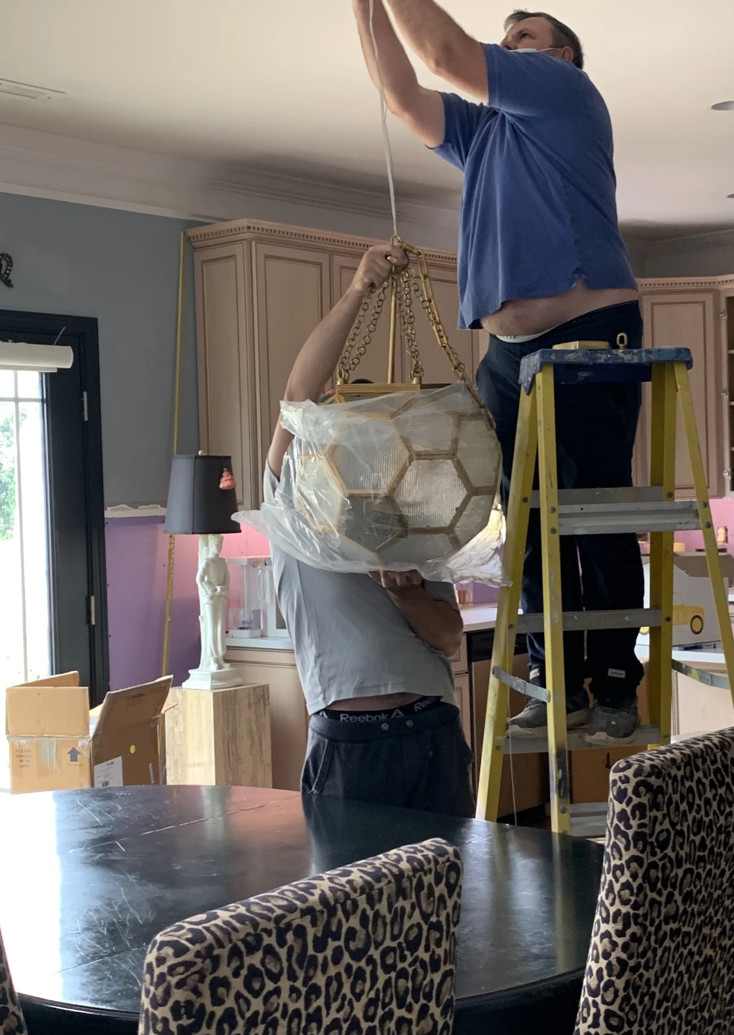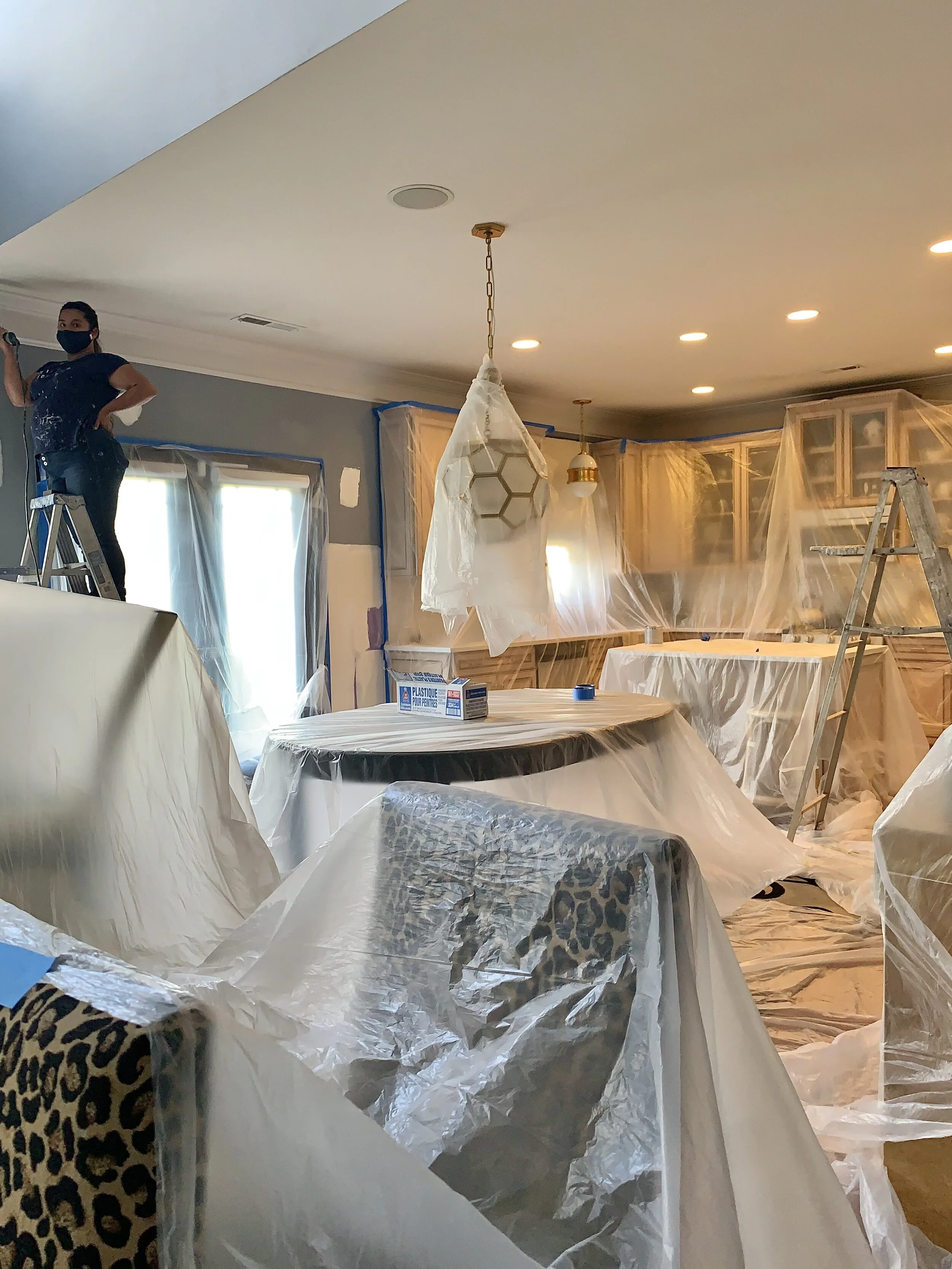 Ceiling being painted Chantilly Lace by Benjamin Moore