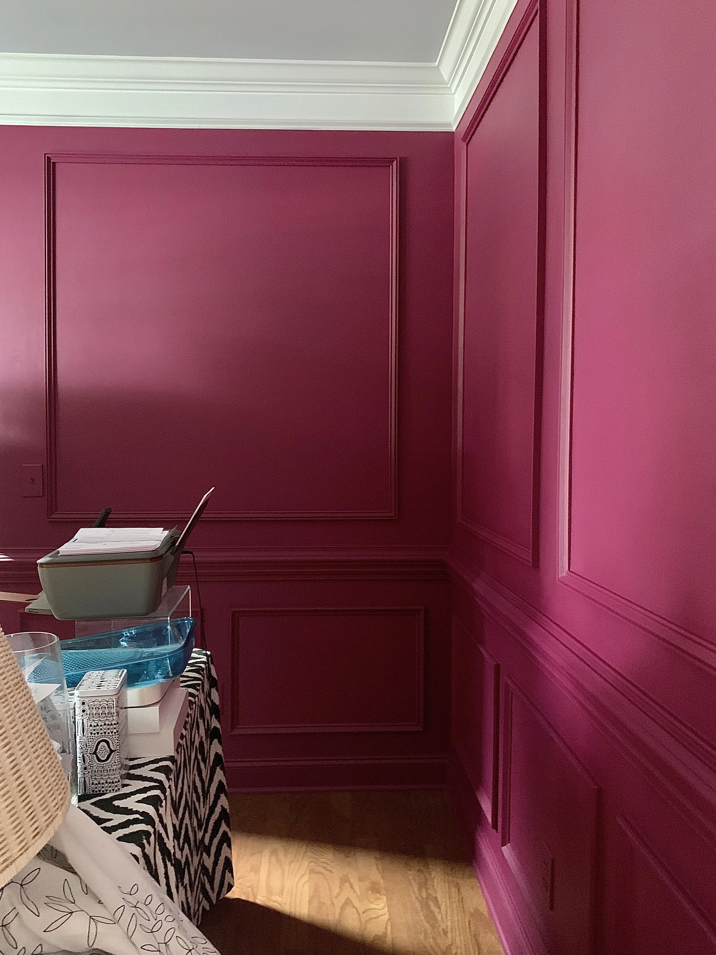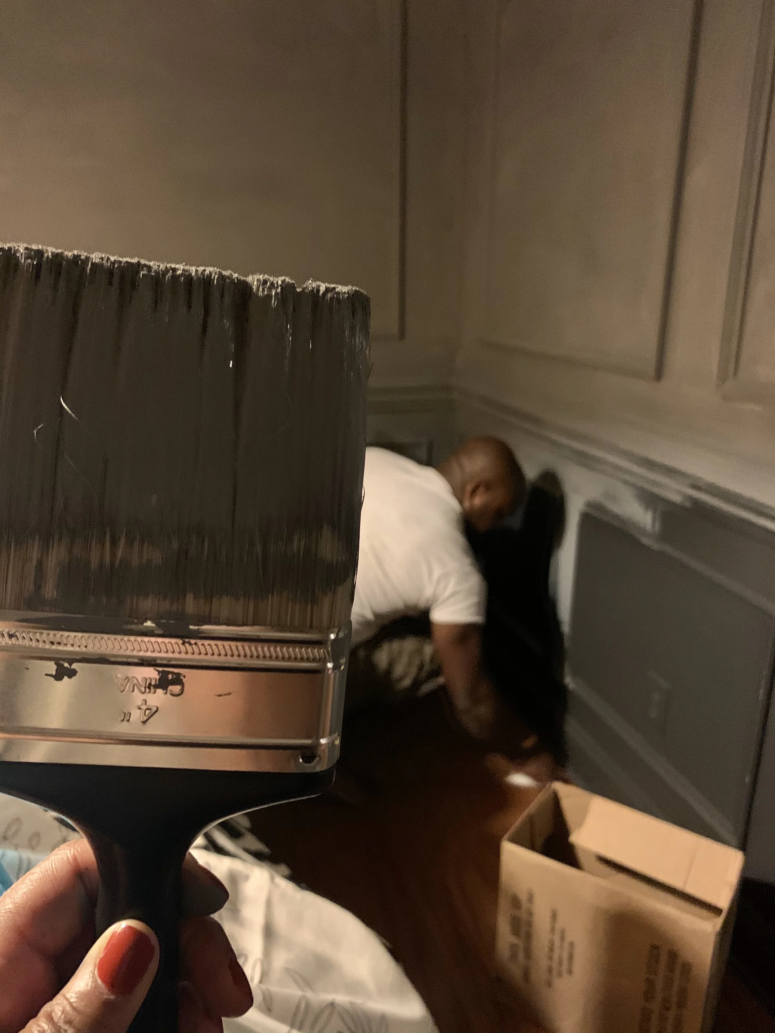 We are rolling right along into week 4! So last week the moldings were installed and my husband and I painted the room over the weekend. Painting wasn’t as horrible as we imagined. We had all the tools (primer, paint, brushes) and good music. We started priming the room on Saturday night and finished painting Sunday night. We painted the room with brushes instead of rollers because of the molding on the top and bottom. If you remember correctly the room was black on the bottom and white on top, so we used a grey primer (recommended for this paint color) to make the walls all one color so Frambroise wouldn’t appear lighter on top and darker on bottom.