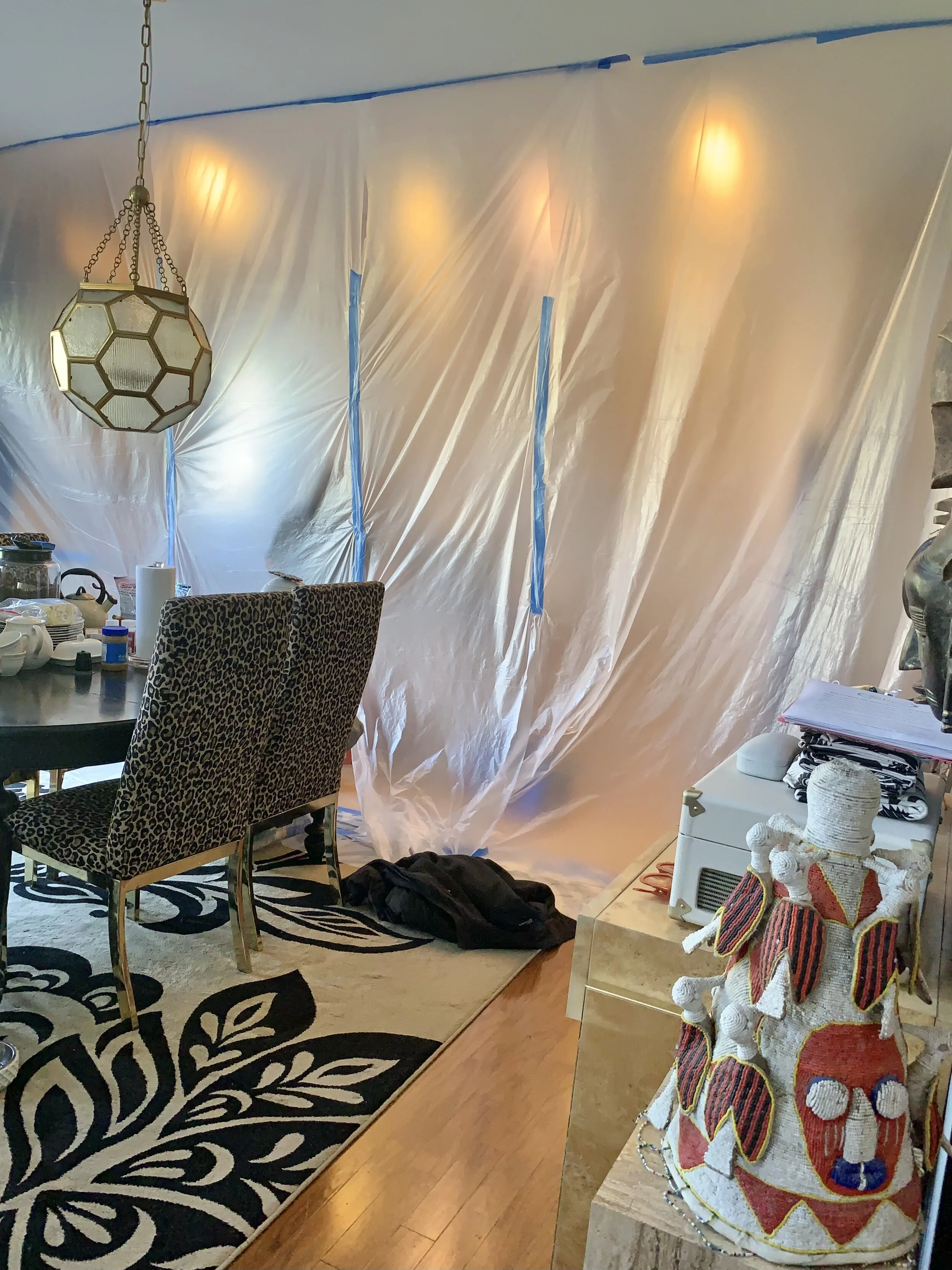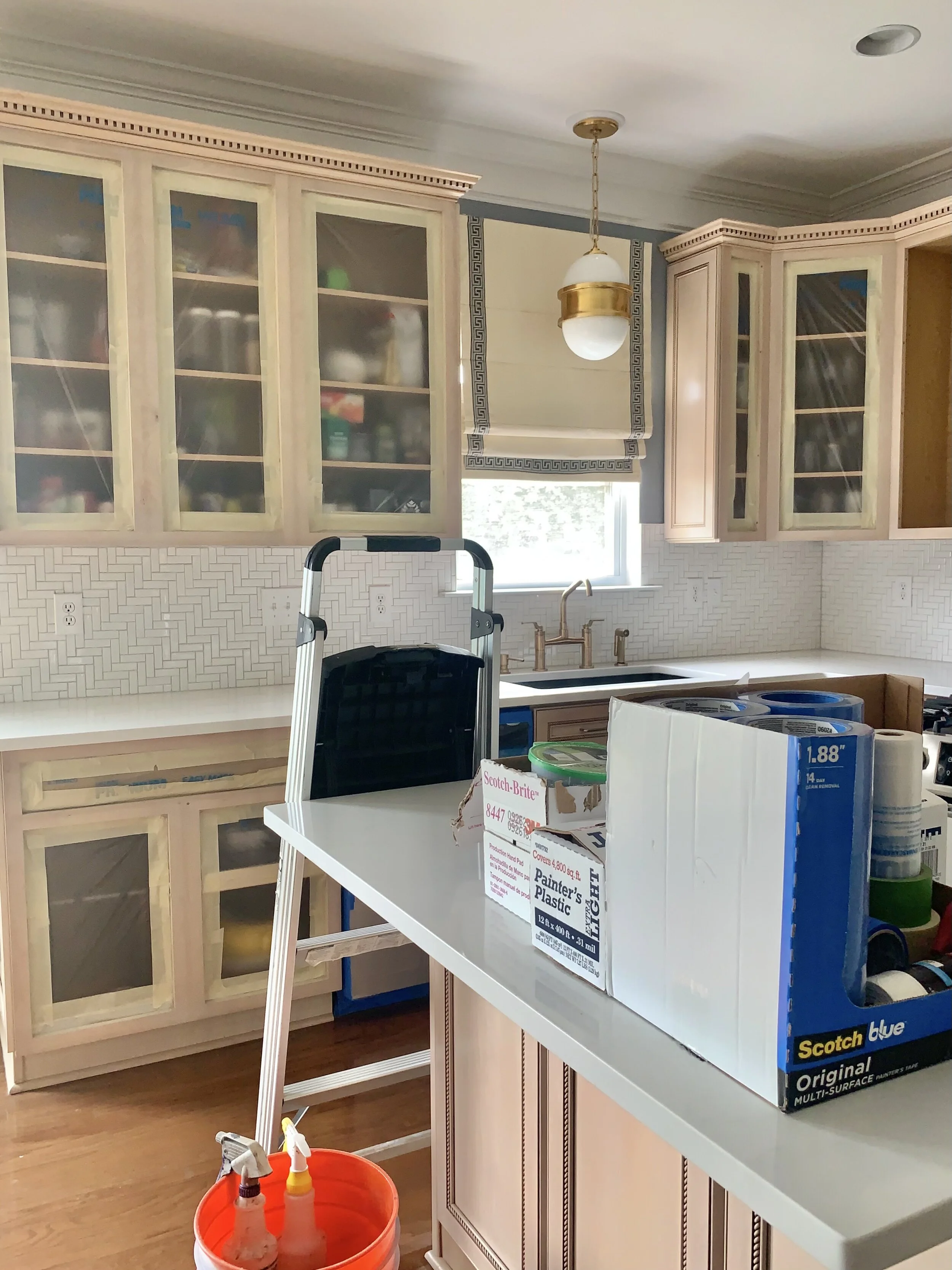 It is week 5 and it’s time to paint the kitchen cabinets! This is the moment I’ve waiting 14 years and I have butterflies in my stomach with anticipation. The first few days were filled with cleaning the cabinets and then taping them before spraying. Consider these the last photos you will see until the final reveal. You gotta have something to look forward to, right?